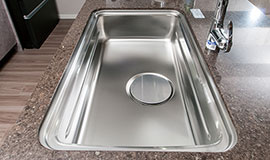 制振材を裏底に用い、水が跳ねる音を軽減。大きな鍋や、中華鍋も余裕で洗える大型サイズを採用。洗剤等を入れておける便利な小物置き付きです。