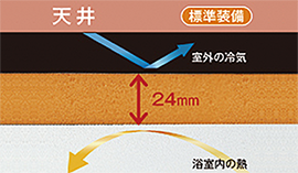 天井には24mm、壁には16mmの保温材を標準装備。高い断熱性能を持ち、室外の冷気をシャットアウトします。※浴槽断熱はオプションとなります。